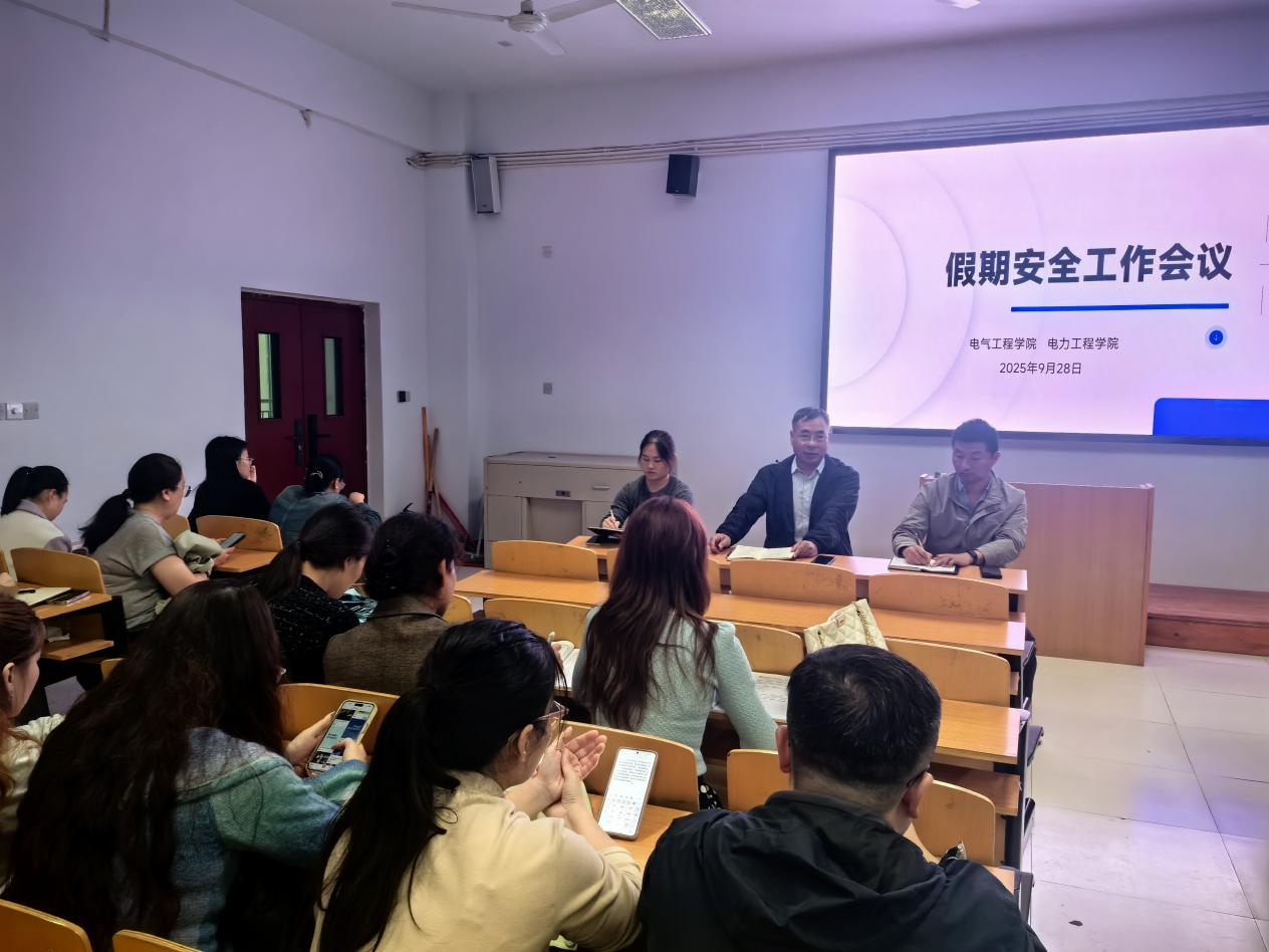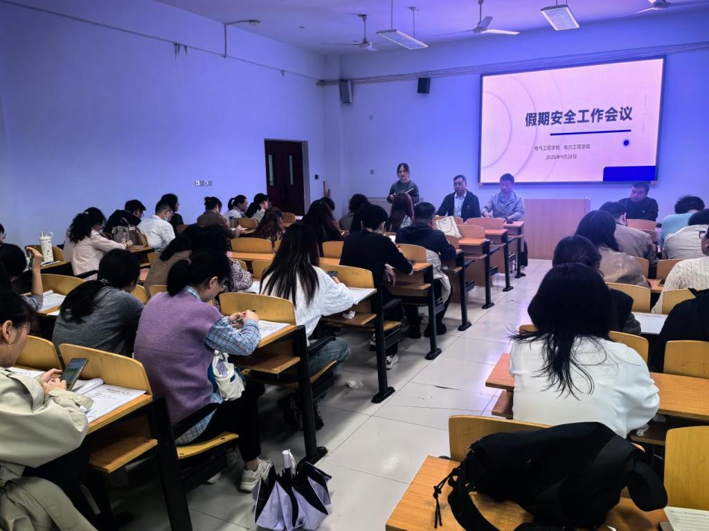 为保障十一假期学生安全,防范安全事故,9 月28日,电气工程学院、电力工程学院召开十一假期安全工作专题会议。学院领导班子、各年级辅导员及班主任参会,团总支负责人徐爽主持会议,党总支负责人朱金伟作总结讲话。