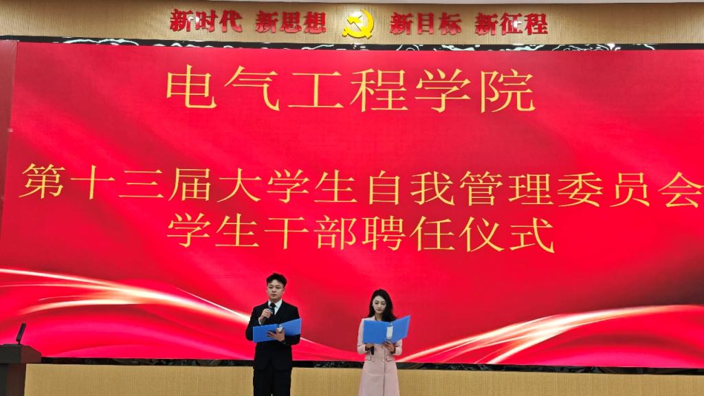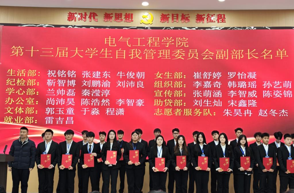 仪式在庄严的国歌声中正式开始。电力工程学院行政负责人杜瑞涛首先宣读了本届自管会各部门副部长名单。来自生活部、纪检部等十余个部门的三十余名同学依次上台,郑重接过聘书,标志着他们正式肩负起服务同学、协助管理的职责。