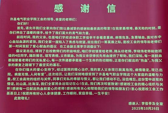 日前,李老师的家人专程来到学校,送来了一封情真意切的感谢信。信中没有华丽的辞藻,只有一遍遍的“谢谢”和发自肺腑的感激之情。家属动情地表示:“这份雪中送炭的情谊比山高、比海深,我们全家人深表感谢。许昌电气职业学院不仅是一个教书育人的地方,更是一个充满人情味和凝聚力的大家庭!”