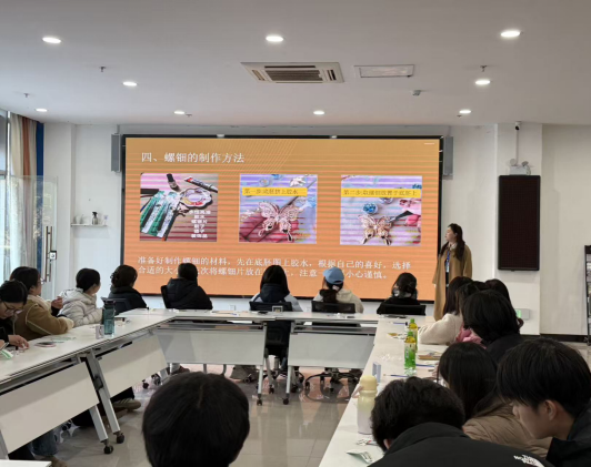 活动现场,主持人首先为同学们系统讲解了螺钿技艺的历史源流和当代创新。非遗工坊志愿者为学生们讲解制作要点,同学们凝神聆听,不时记录要点。讲解结束后,大家跃跃欲试,投入制作环节——从色彩构思、选配螺片,到切割塑形、精细打磨,再到镶嵌拼贴、抛光润色,一步步沉浸于螺钿制作的完整工序之中,亲身感受传统工艺从材料到成品的蜕变过程。