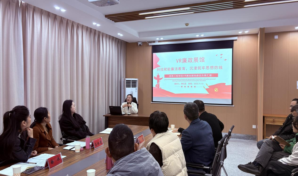 数字媒体技术教研室负责人李红亚老师以“科技赋能廉洁教育,沉浸筑牢思想防线”为主题对信息工程学院VR廉政展馆建设方案进行了汇报。她表示信息工程学院将依托虚拟仿真技术应用专业优势,以“党风为引领、政风为支撑、校风为基础、教风为示范、学风为延伸”的逻辑链条,构建“五馆联动、全域覆盖”的沉浸式廉洁教育阵地,呼应清廉学校建设中“党风清正、政风清明、校风清朗、教风清淳、学风清新”的目标。目前已完成主体框架搭建,后续逐步完成各个场馆搭建工作。汇报结束后,学生代表现场演示自主研创的VR作品,随后,信息工程学院领导班子成员陪同校纪委一行实地调研了学院正在建设的河南省虚拟仿真高技能人才培养基地。