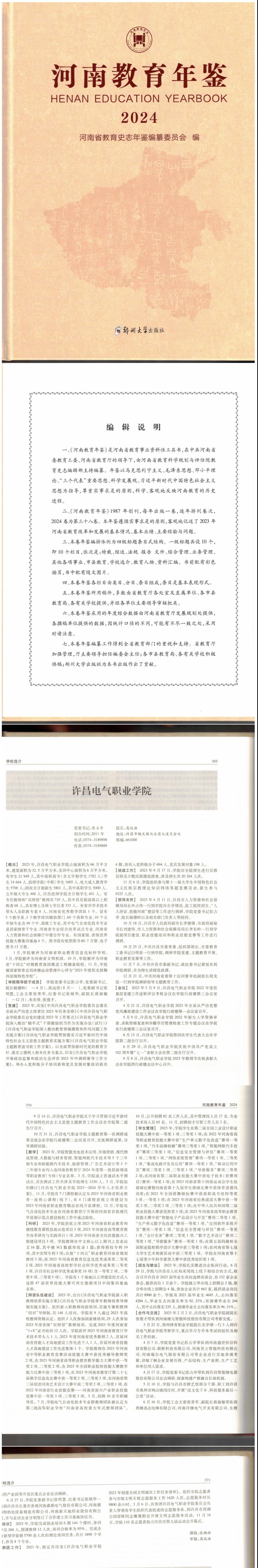 近日,由郑州大学出版社出版的《河南教育年鉴2024卷》正式发行,收录了包含全省本专科、中高职、中小学、幼儿园、特殊学校等131所优秀学校选介,我院为其中之一。《河南教育年鉴》是河南省教育事业资料性工具书,在中共河南省委教育工委、河南省教育厅的领导下,厅主要领导担任编委会主任,由河南省教育科学规划与评估院教育史志编辑部主持编纂。许昌电气职业学院提交的2023年度年鉴供稿因内容详实、特色鲜明,被全文收录至“学校选介”栏目。这是我院近年来首次入选省级教育年鉴,标志着学校在产教融合、人才培养、社会服务等领域取得的成果获得省级权威认可。