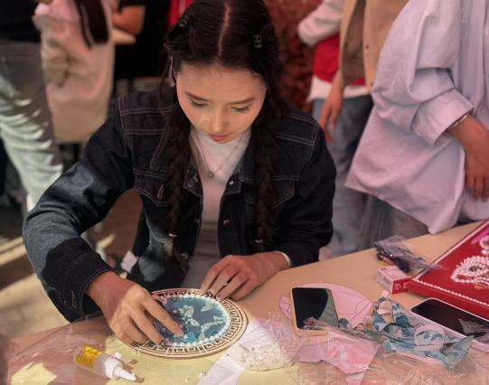接着,进入了沉浸式的体验环节。同学们手持镊子,小心翼翼地将一颗颗饱满温润的珍珠,精心点缀于宋锦底布之上。不同于传统刺绣的丝线穿梭,珍珠画的制作更考验耐心与专注力。大家屏气凝神,将散落的珍珠巧妙拼接,或成花鸟鱼虫,或作山水意境,皆在指尖缓缓成型。活动现场安静而有序,只有珍珠碰撞的细微声响与同学们专注创作的身影,大家在与非遗材料的指尖对话中,感受着非遗传统工艺独有的宁静与治愈。
