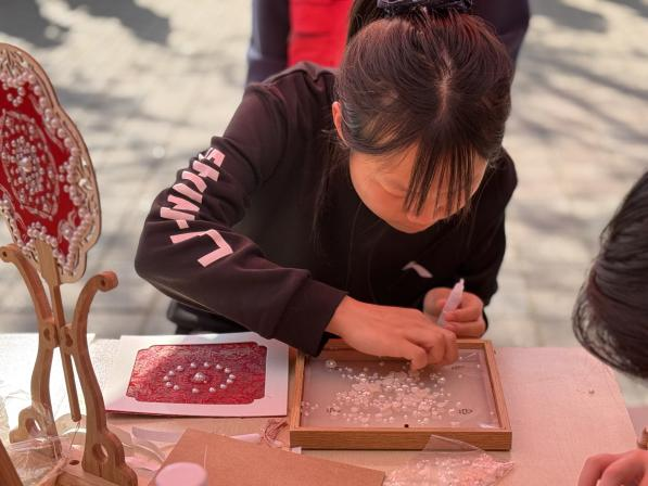 活动伊始,校园非遗工坊志愿者向同学们介绍宋锦作为“锦绣之冠”的历史地位与工艺精髓,详细介绍了宋锦珍珠画、珍珠扇的构图设计和排列技巧,让同学们在实践中对这项融合了织造与镶嵌艺术的非遗技艺,形成了直观且深刻的认知,一场视觉与文化的双重盛宴就此展开。