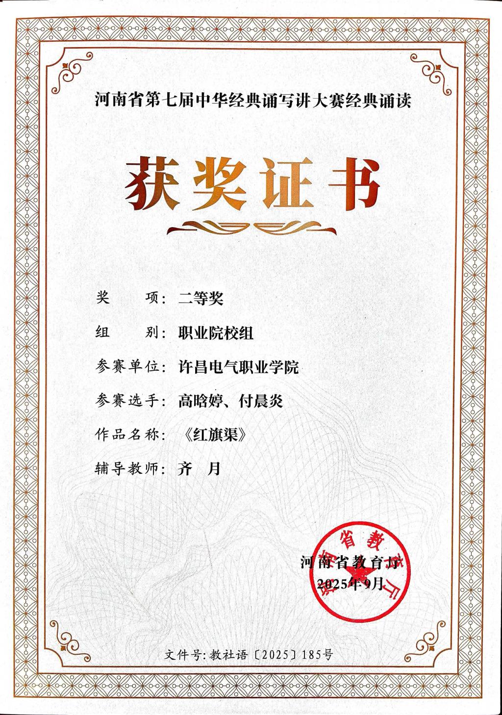 近日,由河南省教育厅主办的河南省第七届中华经典诵写讲大赛和许昌市教育局主办的“典籍里的中国”中华经典诵读大赛圆满落幕,我校参赛师生斩获省级二等奖1项、市级一等奖1 项;二等奖4项