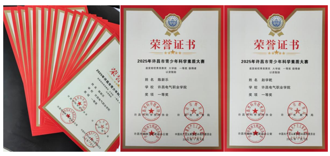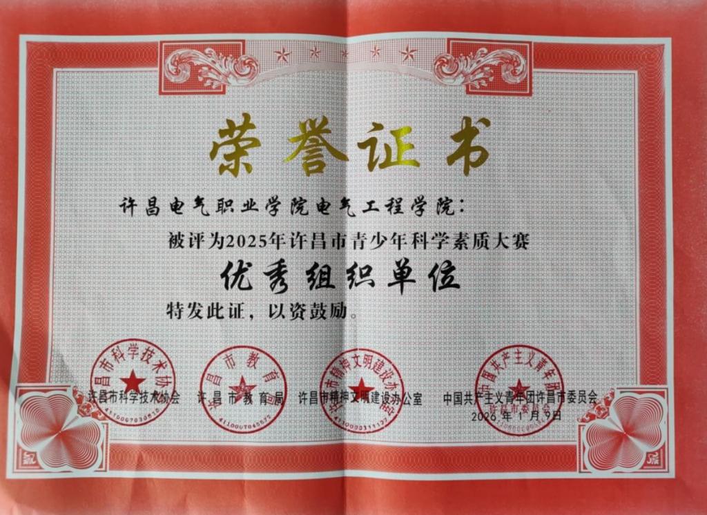 近日,2025年许昌市青少年科学素质大赛获奖名单揭晓。电气工程学院、电力工程学院学子奋勇拼搏、表现突出,在全市8.57万余名参赛选手中脱颖而出,共荣获16项市级奖项,其中大学组一等奖5项、二等奖7项、三等奖4项,我院高度重视、周密安排,在此次大赛中荣获“优秀组织奖”,充分彰显了学院人才培养的扎实成效。