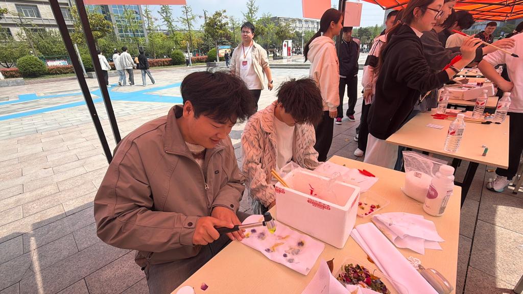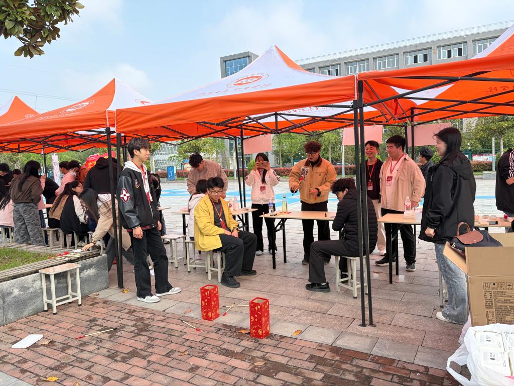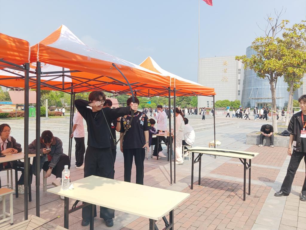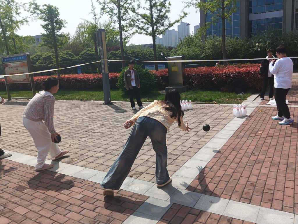 活动体验区以传统习俗为根基,开展四项特色体验项目,让同学们在动手实践中感受传统文化魅力。射柳寄情体验还原古人清明雅趣,安全软质箭矢让同学们在轻松体验中领略传统游艺之美;保龄球游戏模拟古人趣味滚球,贴合踏青习俗,增添活动活力;传统投壶项目再现古代礼仪风尚,让大家在投壶竞技中感悟尚礼崇德的文化内涵;植物拓印体验将春日花草“敲”进棉布,把自然生机与手工创意融为一体。同学们有序参与,现场氛围热烈而有序。